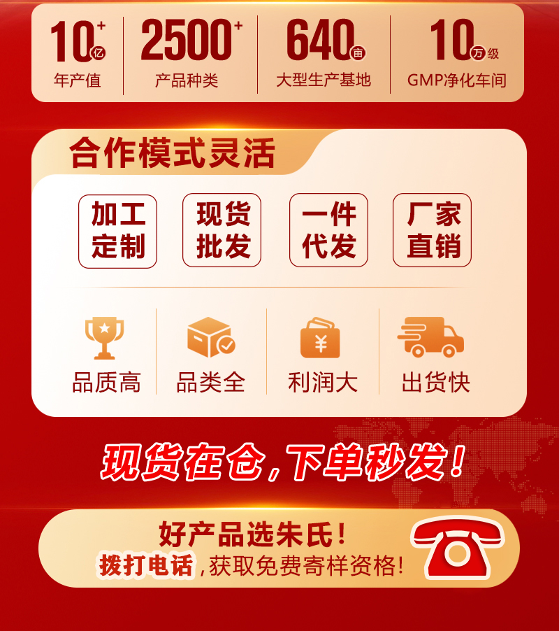 山东朱氏药业集团成立于2003年,有22年的行业经验,资质文号齐全。拥有3个产业园,500多条生产线,可以现货代理也可贴牌代工。免费打样和设计包装,详情可拨打18553058182(微信同号)获取优惠方案! |